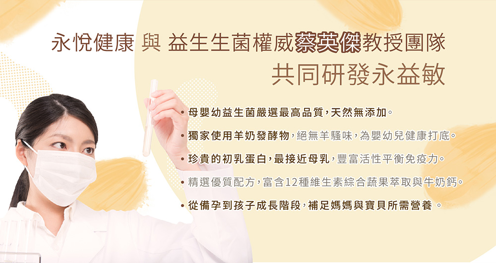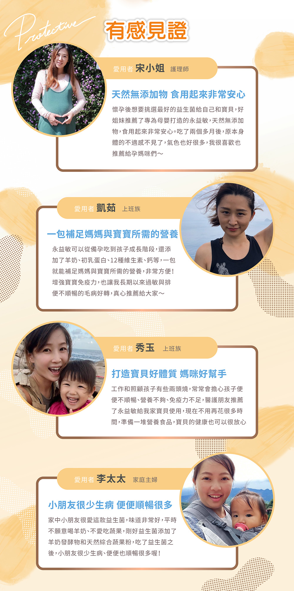 母嬰幼益生菌嚴選最高品質,天然無添加。獨家使用羊奶發酵物,絕無羊騷味,為嬰幼兒健康打底。珍貴的初乳蛋白,最接近母乳,豐富活性提升免疫力。精選優質配方,富含 12 種維生素綜合蔬果萃取與牛奶鈣。從備孕到孩子成長階段,補足媽媽與寶貝所需營養。