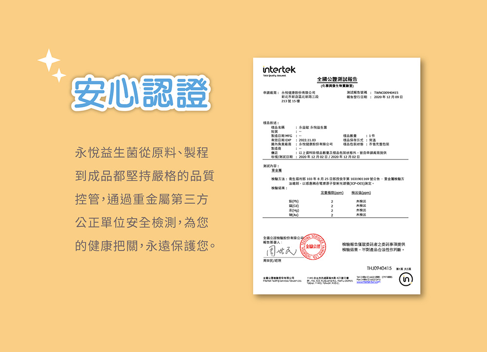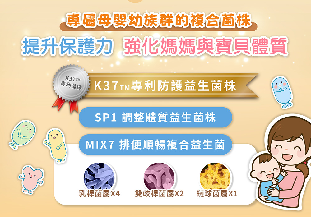 - 成份:菊糖、 玉米來源可溶性纖維、乳糖、菊苣纖維寡多糖 、牛奶鈣、牛初乳、複合乳酸菌Lactobacillus rhamnosus SP1、Lactobacillus plantarum K37 TM、Streptococcus thermophilus, Lactobacillus delbrueckii ssp. bulgaricus, Lactobacillus acidophilus, Lactobacillus plantarum, Lactobacillus paracasei, Bifidobacterium breve, Bifidobacterium animalis ssp. lactis、綜合蔬果粉菠菜.花椰菜.胡蘿蔔.甜菜.番茄.香菇.蘋果.蔓越莓.橘子.藍莓.草莓、羊奶醱酵物。